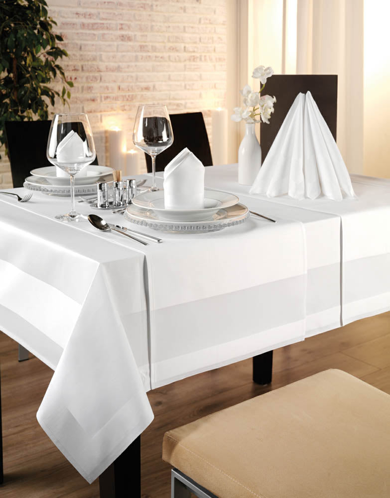 Schwere und robuste Tischdecke aus fein gewebtem Damast. Die durch Mercerisation veredelte, gekämmte Baumwolle macht die Tischdecke ideal für den Hotel-Alltag. Materialgewicht beträgt 210g/m³.