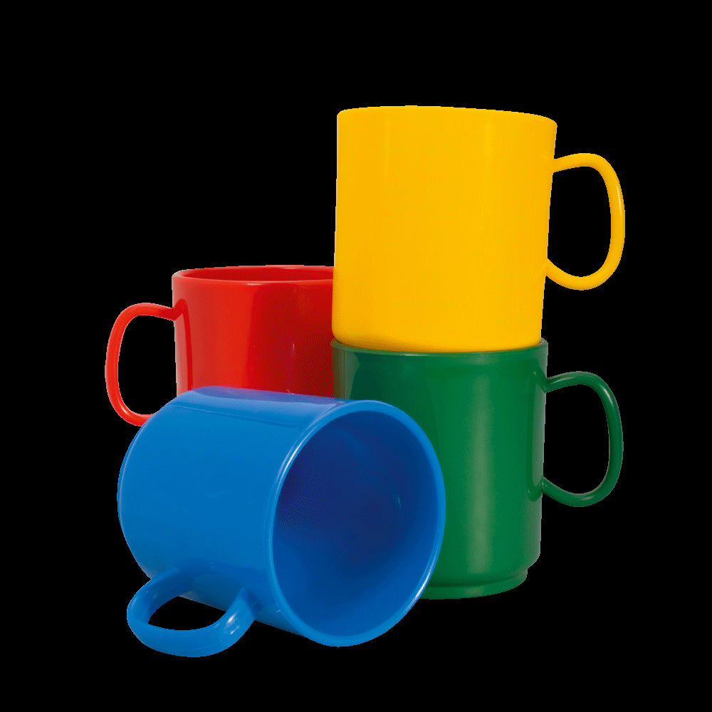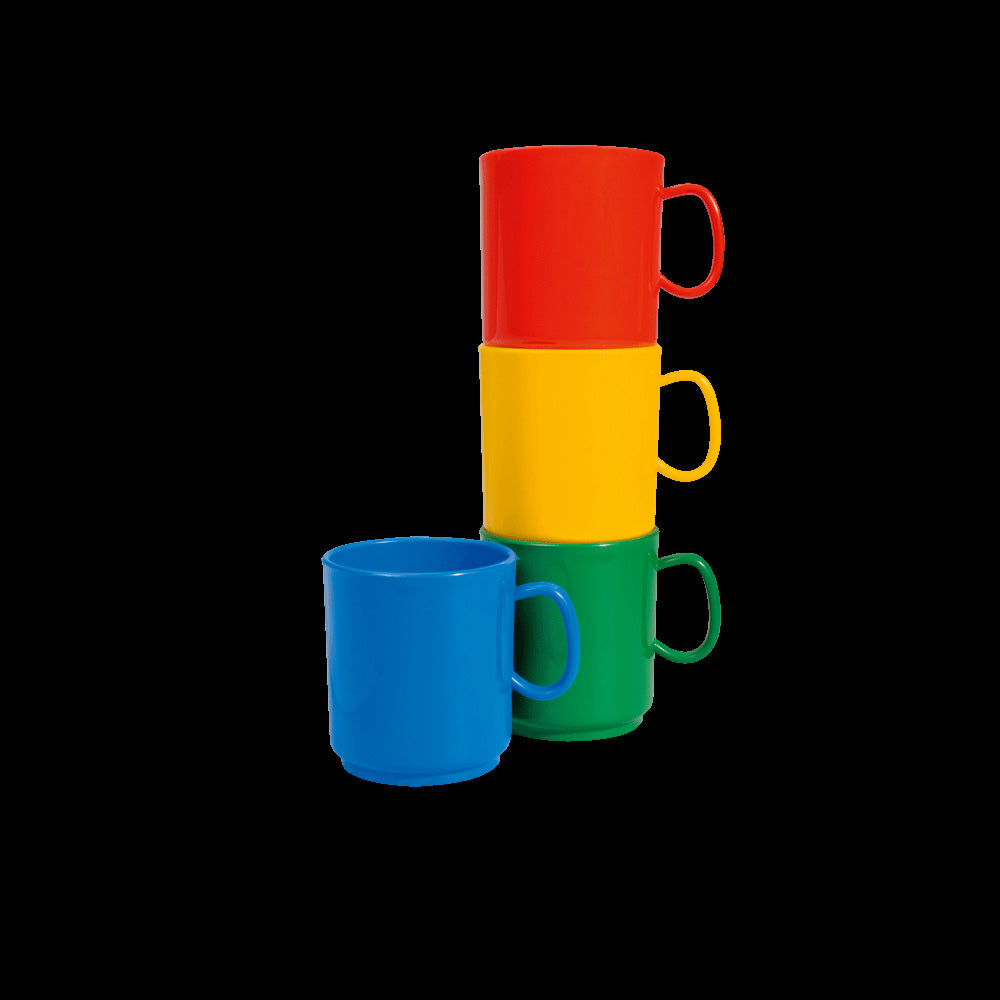 Farbiger Henkelbecher aus unzerbrechlichem, BPA-freiem PP-Kunststoff. Spülmaschinenfest, stapelbar und mikrowellengeeignet. Inhalt 25 cl - Ø 7,8 x 8,7 cm.