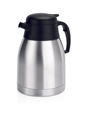 Unzerbrechliche Kannen mit Druckknopf für Einhandbedienung. Korpus aus satiniertem, doppelwandigem Edelstahl. Montur und Schraubdeckel aus hochwertigem, mattschwarzem Kunststoff.