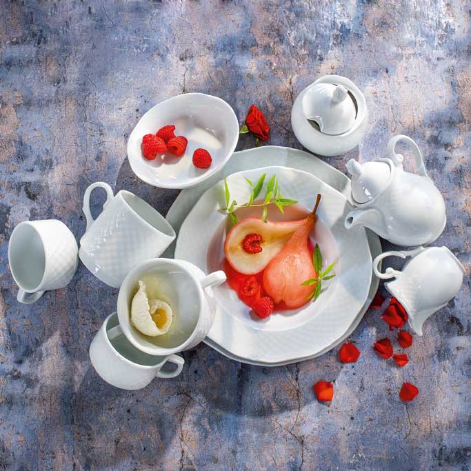 Das stilvolle Kreuzrelief verleiht diesem Porzellan seine ganz persönliche Note.