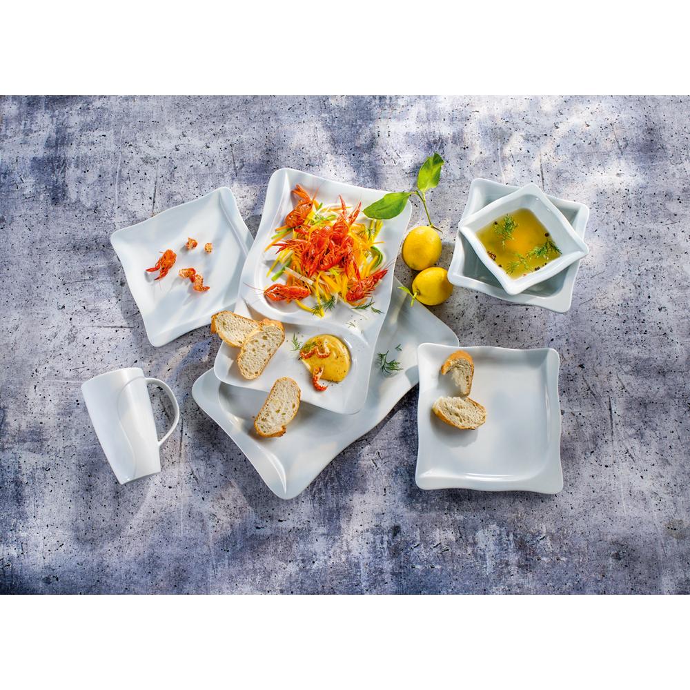 Die Serie aus reinweißem Hartporzellan bringt Schwung auf den Tisch und unterstützt mit ihren fließenden Formen das kreative Anrichten der Speisen.