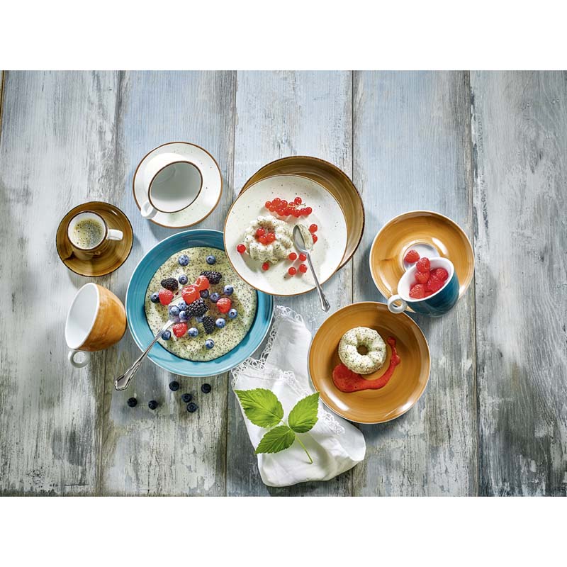 Sie vereint ein farbenfrohes Töpferei-Dekor mit individuellem Charakter auf einer Basis aus reinweißem Hotelporzellan mit einem Scherben von hervorragender Qualität, welche das Geschirr besonders widerstandsfähig macht.