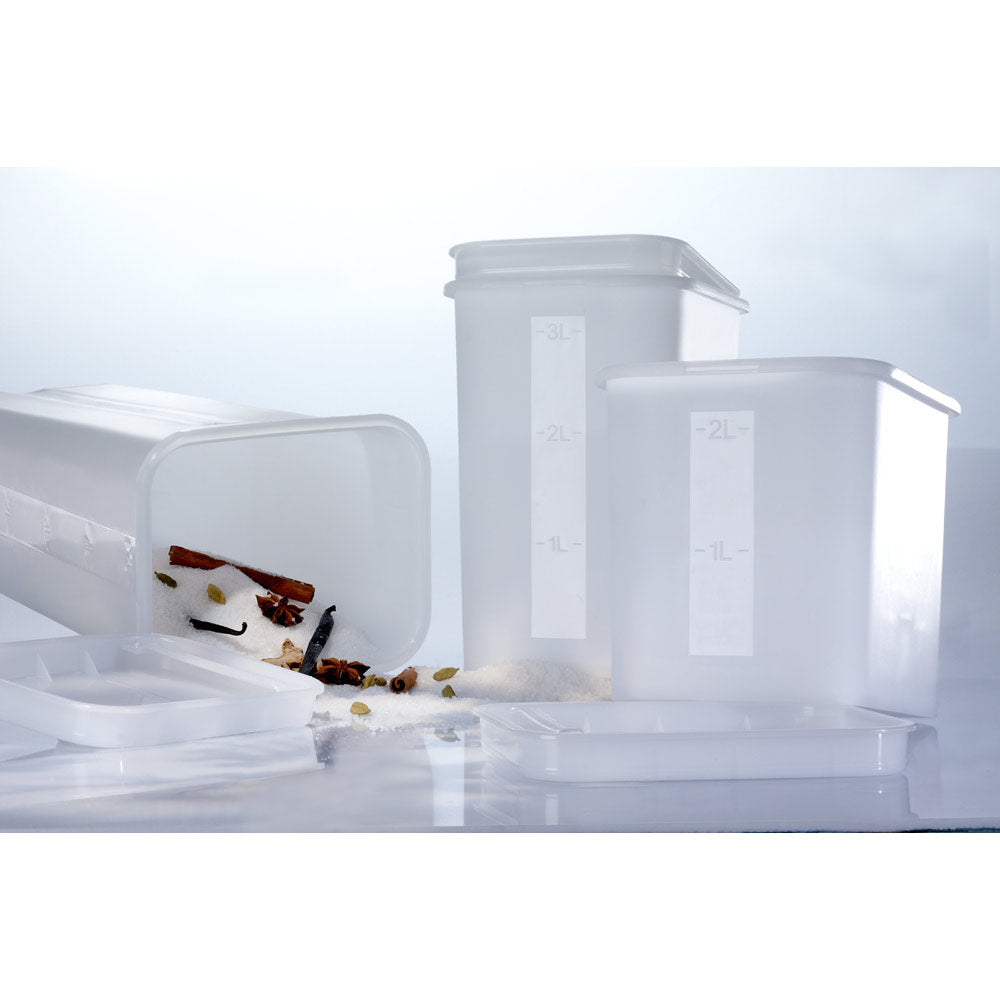Preisgünstige, extrem belastbare Dosen aus halbtransparentem PP-Kunststoff. Rechteckige Form mit Literskala an der Frontseite. Leer platzsparend innerhalb einer Größe nestbar, mit Deckel auch gemischt stabil stapelbar. Fest- und dichtschließender Steckdeckel aus weißem PE-Kunststoff mit praktischer Griffmulde. Lebensmittelecht, tiefkühl- und spülmaschinenfest. Lieferung der Dosen erfolgt ohne Deckel - bitte separat bestellen (Nr. 23591).