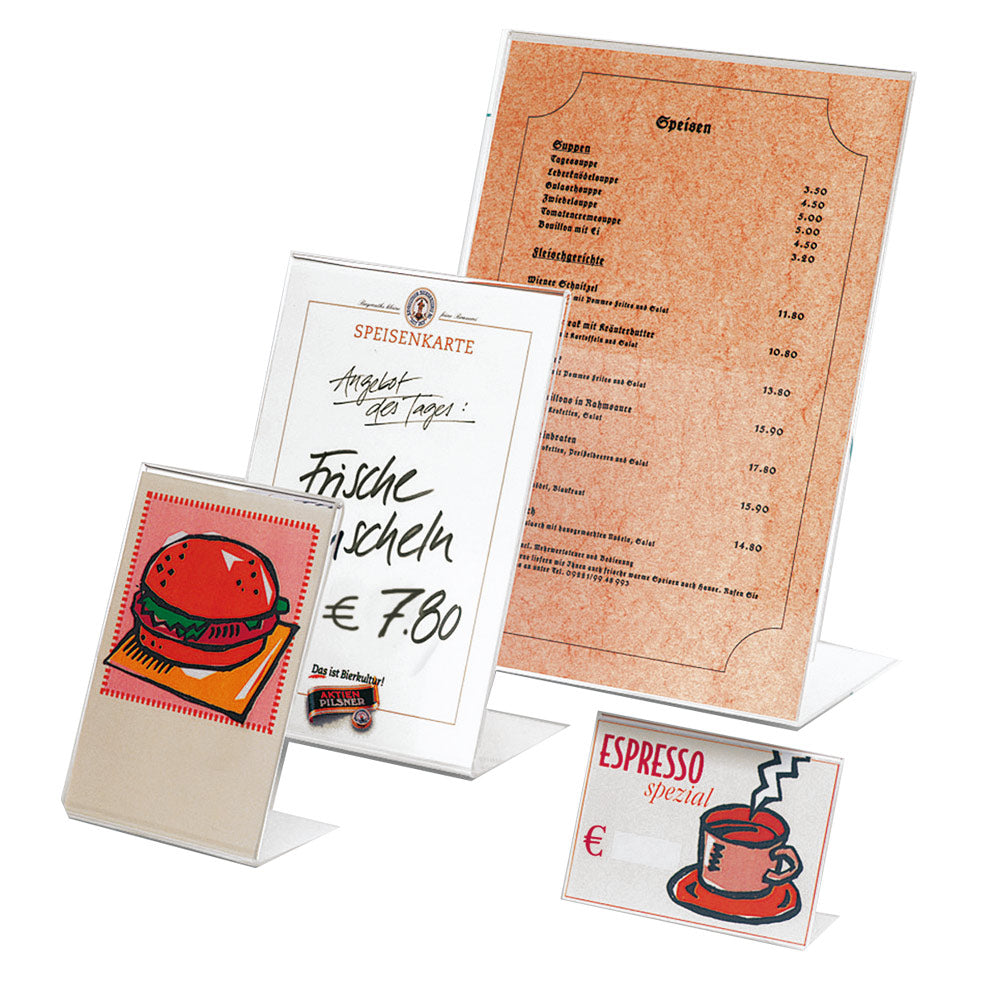 Freistehende Aufsteller aus hochklarem Acryl (Format A7 aus flexiblem PVC-Kunststoff) mit seitlichem Einschub. Praktische DIN-Größen zur Aufnahme aller gängigen Papierformate.