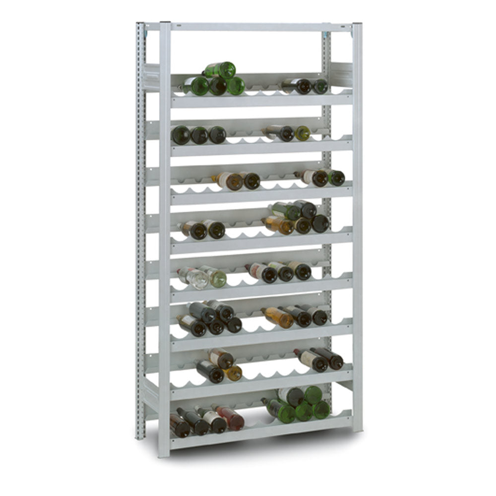 Robustes Spezialregal zur sicheren Lagerung von Weinflaschen auf 8 Ebenen. Kapazität bis zu 152 Flaschen (bei doppelreihigem Legen der Flaschen). Komplett aus verzinktem Stahl mit Kunststoffbeschichtung, korrosionsbeständig und sehr stabil. Fachlast bis zu 35 kg. Größe 106 x 33,5 x 200 cm. Lieferung erfolgt zerlegt - einfache Montage. 5 Jahre Garantie!