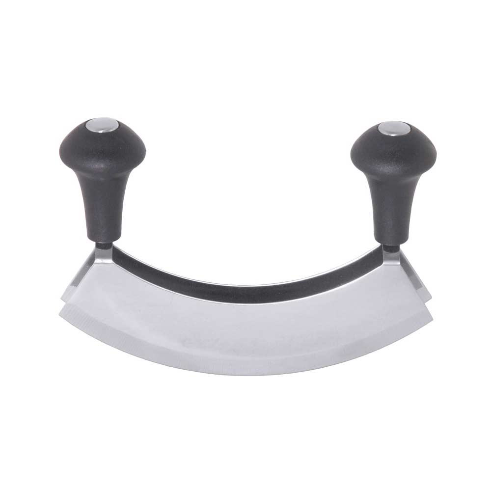 Zweischneidiges Wiegemesser aus Edelstahl 18/0. Mit Griffen aus Polyethylen. Die Größe des Wiegemesser ist 17,5 x 3,7 x 2 cm.