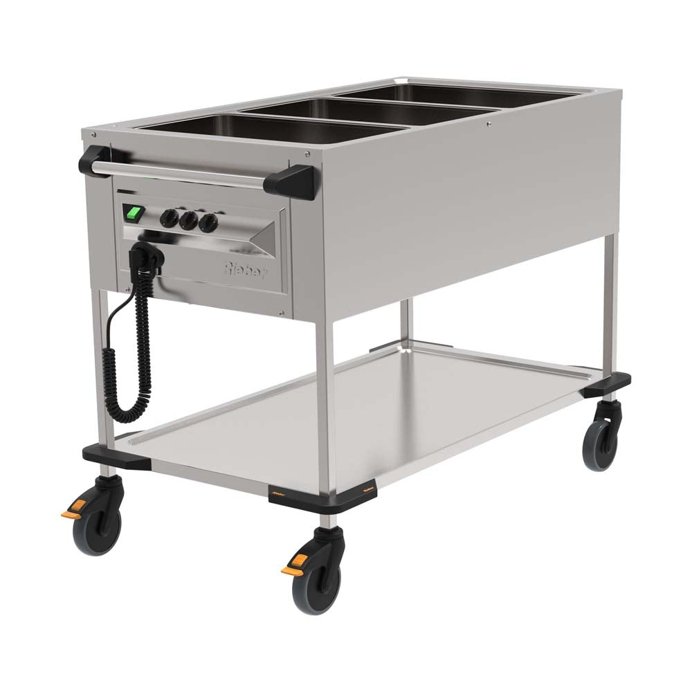· offener Transportwagen · drei Becken für Gastronorm-Behälter GN 1/1 - bis zu 200 mm Tiefe · Becken nass und trocken beheizbar, inkl. Ablauf · Temperatur pro Becken separat per Thermostatregler stufenlos einstellbar von 30° C bis 110° C · komplett aus rostfreiem Edelstahl 18/10 · stirnseitiger Schiebegriff · vier Stoßecken · rostfreie Rollenausstattung, zwei Bockrollen, zwei Lenkstopprollen, Rollen-Ø: 125 mm · 2,5 Meter Spiralanschlusskabel · Gewicht: 44,2 kg · Anschluss: 230 Volt, Leistung: 1.410 Watt · Maße: 1185 x 678, x 900 mm Sonderartikel, Rückgabe und Umtausch ausgeschlossen.